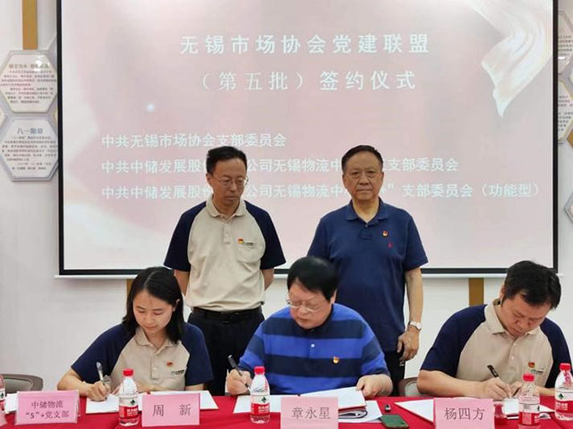 隨后,黨建聯(lián)盟第五批成員:中儲(chǔ)股份無(wú)錫物流中心第三黨支部、中儲(chǔ)股份無(wú)錫物流中心“5+”黨支部(功能型),在章永星會(huì)長(zhǎng)、周新副書(shū)記的監(jiān)簽和參會(huì)人員的共同見(jiàn)證下,與黨建聯(lián)盟發(fā)起單位無(wú)錫市場(chǎng)協(xié)會(huì)黨支部正式舉行了簽約儀式。