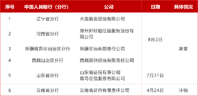 8月2日,中國(guó)人民銀行4家分行分別對(duì)4家公司的企業(yè)征信業(yè)務(wù)經(jīng)營(yíng)備案事項(xiàng)進(jìn)行了公示。