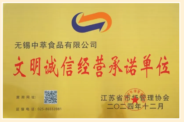 近日,經(jīng)江蘇省市場管理協(xié)會評定,授予無錫中萃食品有限公司“文明誠信經(jīng)營承諾單位”稱號。