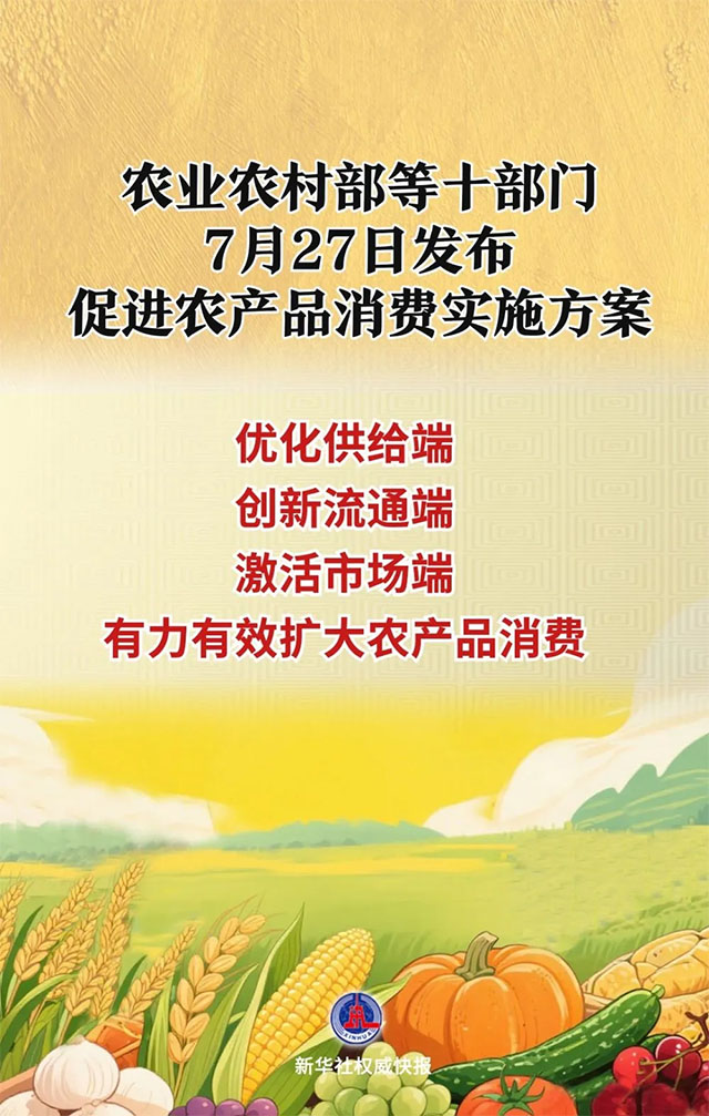 為貫徹落實黨中央、國務(wù)院關(guān)于大力提振消費的決策部署,有力有效擴大農(nóng)產(chǎn)品消費,農(nóng)業(yè)農(nóng)村部、國家發(fā)展改革委、教育部、工業(yè)和信息化部、商務(wù)部、文化和旅游部、國家衛(wèi)生健康委、市場監(jiān)管總局、體育總局、國家知識產(chǎn)權(quán)局聯(lián)合制定了《促進農(nóng)產(chǎn)品消費實施方案》。現(xiàn)印發(fā)給你們,請結(jié)合本地實際,采取務(wù)實舉措,認真抓好貫徹落實。