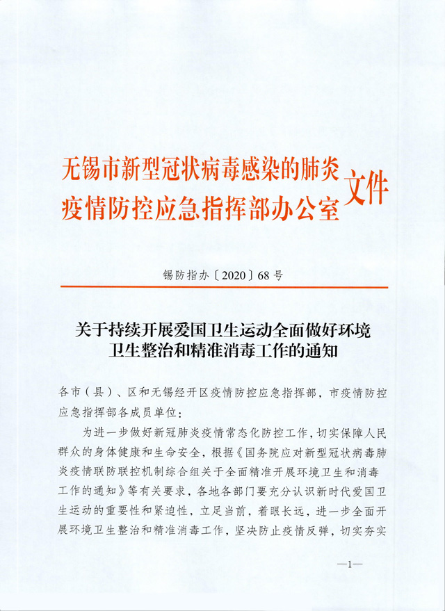 (錫防指辦〔2020〕68號(hào))關(guān)于持續(xù)開展愛國(guó)衛(wèi)生運(yùn)動(dòng)全面做好環(huán)境衛(wèi)生整治和精準(zhǔn)消毒工作的通知