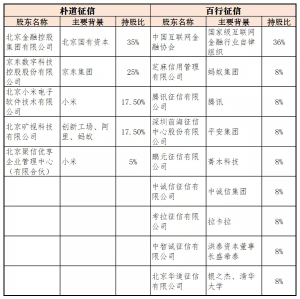 與百行征信相比,兩家均由一個(gè)牽頭方以及多家公司共同組建,但樸道征信股東數(shù)量更少,且全部為公司性質(zhì),除牽頭方外的股東持股比例也不同。