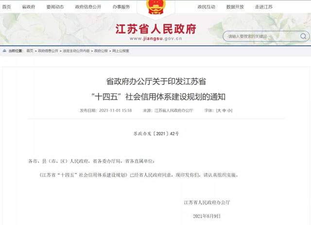2021年11月1日,江蘇省人民政府辦公廳發(fā)布《江蘇省“十四五”社會(huì)信用體系建設(shè)規(guī)劃》,文中主要提及信用法規(guī)、管理、標(biāo)準(zhǔn)化、公共信用信息系統(tǒng)建設(shè)、信用監(jiān)管、現(xiàn)代信用服務(wù)業(yè)、信用惠民等方面內(nèi)容。