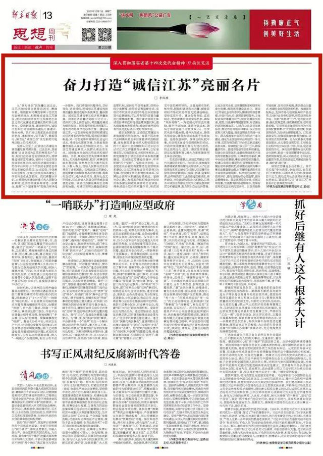 12月7日,新華日?qǐng)?bào)《思想周刊》刊發(fā)了江蘇省發(fā)展改革委黨組書(shū)記、主任李侃楨的署名文章《奮力打造“誠(chéng)信江蘇”亮麗名片》,全文如下: