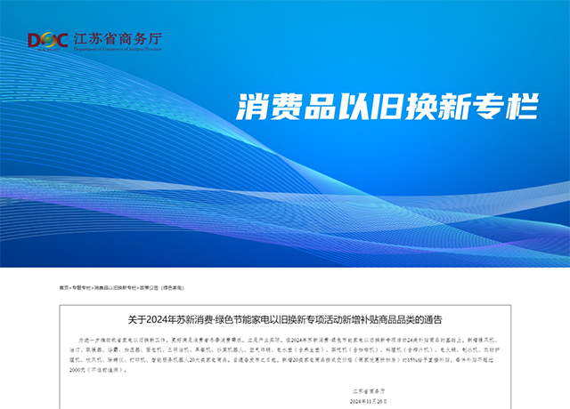為進(jìn)一步推動我省家電以舊換新工作,更好滿足消費者冬季消費需求,立足產(chǎn)業(yè)實際,在2024年蘇新消費·綠色節(jié)能家電以舊換新專項活動24類補(bǔ)貼商品的基礎(chǔ)上,新增暖風(fēng)機(jī)、油汀、取暖器、浴霸、加濕器、面包機(jī)、三明治機(jī)、早餐機(jī)、炒菜機(jī)器人、空氣炸鍋、電水壺(含養(yǎng)生壺)、茶吧機(jī)(含咖啡機(jī))、料理機(jī)(含榨汁機(jī))、電火鍋、制冰機(jī)、衣物護(hù)理機(jī)、吹風(fēng)機(jī)、除螨儀、打印機(jī)、智能服務(wù)機(jī)器人20大類家電商品。自通告發(fā)布之日起,新增20類家電商品按成交價格(商家優(yōu)惠折扣后)的15%給予直接補(bǔ)貼,每件補(bǔ)貼不超過2000元(不往前追溯)。