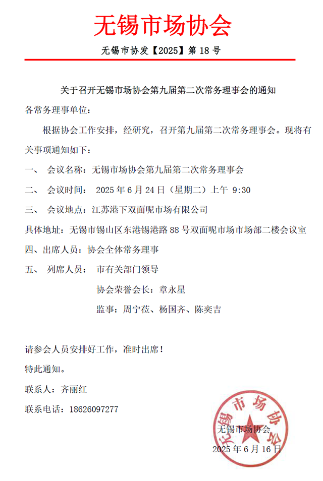 關(guān)于召開無錫市場協(xié)會第九屆第二次常務(wù)理事會的通知