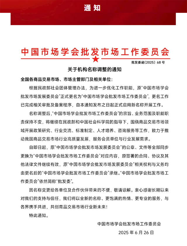 中國(guó)市場(chǎng)學(xué)會(huì)批發(fā)市場(chǎng)工作委員會(huì)關(guān)于機(jī)構(gòu)名稱(chēng)調(diào)整的通知