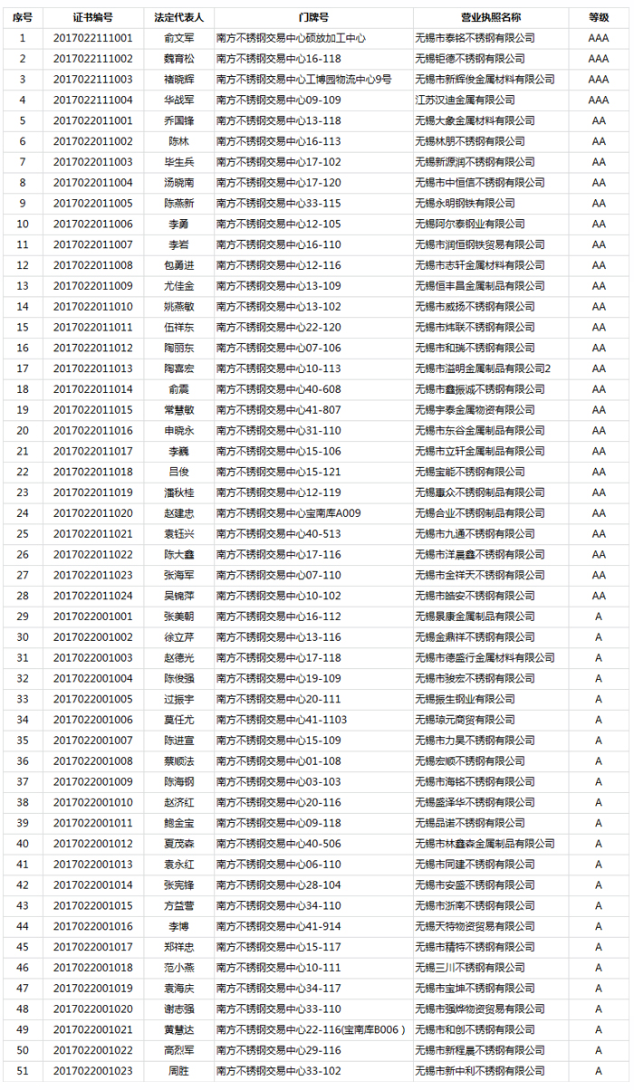 2017年南方不銹鋼市場商務(wù)誠信評(píng)級(jí)試點(diǎn)結(jié)果名單