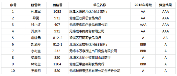 根據(jù)無(wú)錫市商務(wù)局《無(wú)錫市開(kāi)展商務(wù)誠(chéng)信評(píng)級(jí)試點(diǎn)工作指導(dǎo)意見(jiàn)(試行)》、無(wú)錫市場(chǎng)協(xié)會(huì)《開(kāi)展商務(wù)誠(chéng)信試點(diǎn)工作實(shí)施方案》文件精神和要求,無(wú)錫市場(chǎng)協(xié)會(huì)組織相關(guān)市場(chǎng)和評(píng)估公司,對(duì)無(wú)錫金橋國(guó)際食品城、無(wú)錫南方不銹鋼市場(chǎng)于2016年、2017年開(kāi)展商務(wù)信用評(píng)級(jí)試點(diǎn)的企業(yè)商戶進(jìn)行評(píng)級(jí)復(fù)查工作,經(jīng)過(guò)市場(chǎng)推薦、隨機(jī)抽樣復(fù)查、第三方信用評(píng)估機(jī)構(gòu)獨(dú)立評(píng)估等規(guī)定程序,截止2018年6月30日,評(píng)級(jí)復(fù)查工作基本結(jié)束,現(xiàn)將20家企業(yè)商戶評(píng)級(jí)復(fù)查結(jié)果公示如下(排名不分先后):