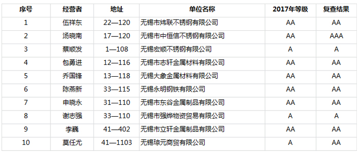 2018年南方不銹鋼市場(chǎng)商務(wù)誠(chéng)信評(píng)級(jí)復(fù)查名單