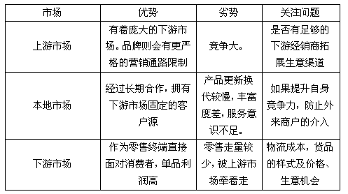 針對(duì)三個(gè)市場(chǎng)關(guān)注的問(wèn)題不一樣,我們可以各個(gè)擊破。一般來(lái)說(shuō),本地市場(chǎng)是最重要的,同時(shí)也是最難撬動(dòng)的,特別是本地有成熟的批發(fā)市場(chǎng),而且又不看好新項(xiàng)目的情況下,更加要從上下游市場(chǎng)來(lái)觸動(dòng)。