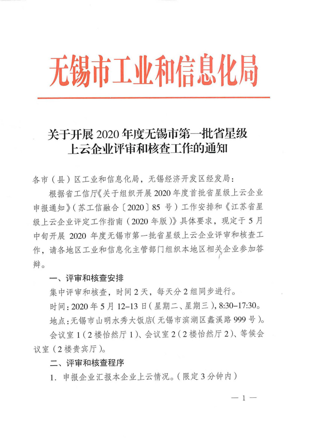 關(guān)于開展2020 年度無錫市第一批省星級(jí)上云企業(yè)評(píng)審和核查工作的通知