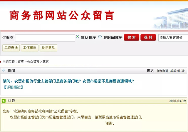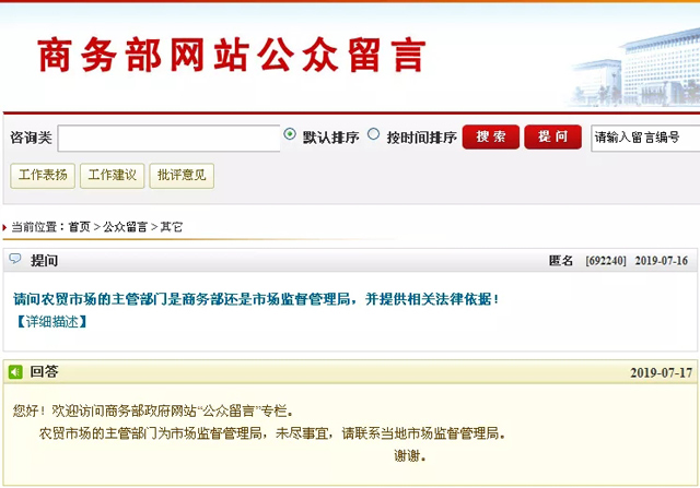 商務(wù)部在回答公眾留言時(shí),居然稱農(nóng)貿(mào)市場的行業(yè)主管部門是市場監(jiān)督管理部門。