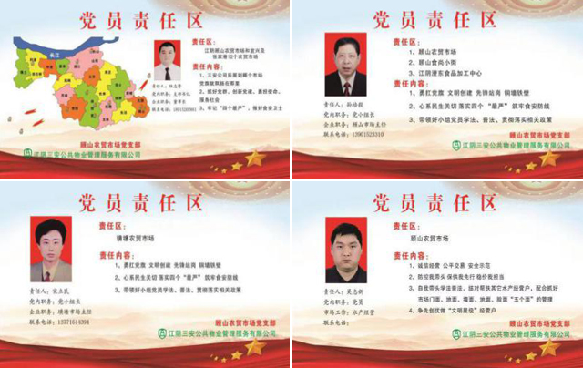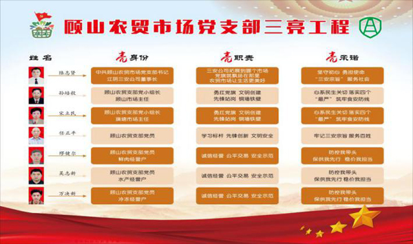 一名黨員就是一面旗幟。顧山農(nóng)貿(mào)市場黨支部共有黨員7人,三安公司其它各市場流動黨員7人,組織有效整合農(nóng)貿(mào)市場黨員人才資源,形成“1+3”黨建工作新模式,即以黨建工作為引領(lǐng)文明市場、星級市場、誠信市場創(chuàng)建。在黨建指導(dǎo)下,每個黨員都可以靈活使用學(xué)習(xí)強(qiáng)國、無錫黨建等平臺,流動黨員在無法參與集中活動時,正常參加組織生活。在黨建指導(dǎo)下,開展關(guān)心關(guān)愛幫扶活動工作,排摸因病致貧人員,每個黨員自愿捐款,解決燃眉之急,彰顯關(guān)懷,凝聚人心。在黨建指導(dǎo)下,每個黨員爭當(dāng)星級文明經(jīng)營戶,主動簽訂黨員承諾書,踐行“三亮”工程,踐行“守法經(jīng)營、誠信經(jīng)營”承諾,爭當(dāng)黨員示范崗、星級黨員商戶、黨員示范店;設(shè)置市場黨員“三亮”公示、市場黨員責(zé)任區(qū)劃定公示、市場黨員積分考核公示、誠信經(jīng)營紅黑榜公示,共同守護(hù)食品安全,共同營造良好的消費環(huán)境。