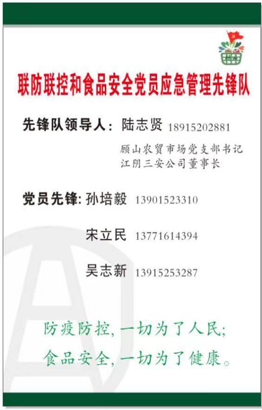 一個市場是一個陣地,在疫情期間,全體黨員以高度的政治責(zé)任感,始終堅持防疫防控,一切為了人民;食品安全,一切為了健康。以董事長陸志賢為先鋒隊領(lǐng)導(dǎo)人,以黨小組長孫培毅和宋立民及黨員骨干吳志新為先鋒,快速成立了聯(lián)防聯(lián)控和食品安全黨員應(yīng)急管理先鋒隊,在防疫期間,發(fā)揮優(yōu)秀典范的引領(lǐng)作用。積極沖在一線,做逆行者,勇扛黨旗,先鋒站崗,不滅冠妖誓不休。