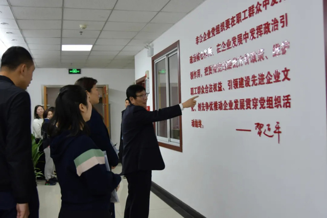 交流會開始之前,華書記首先帶領(lǐng)導(dǎo)參觀了企業(yè)文化宣傳長廊,介紹了公司的發(fā)展理念,并一一介紹了企業(yè)歷年來活動的精彩瞬間和所獲得的的相關(guān)榮譽(yù);在黨員活動室,華書記逐一介紹了黨支部在非公企業(yè)的黨建開展情況,并結(jié)合展板,詳細(xì)介紹了盛陽食品城黨支部黨員掛鉤服務(wù)一線開展的具體工作。公司通過“黨建帶工建”、“黨建帶群建”,在市場與商戶的合作關(guān)系中起到了重要的協(xié)調(diào)作用。周燕燕同志也對盛陽黨支部的工作給予了肯定,她表示,一個企業(yè)黨建工作是否落到實處,關(guān)鍵要看企業(yè)的黨建工作是否能促進(jìn)企業(yè)經(jīng)濟(jì)效益乃至促進(jìn)社會效益,盛陽黨支部,把黨建工作落到了實處。面對市場形形色色、素質(zhì)層次不一的基層人員,很好地協(xié)調(diào)起來,也是為社會和諧夯實了基礎(chǔ)。隨后華總又帶領(lǐng)領(lǐng)導(dǎo)們參觀了企業(yè)發(fā)展歷程長廊、盛陽禮約墻、黨群健身房、心理疏導(dǎo)室、盛陽易鮮達(dá)項目組等。在隨后的驗收過程中,盛陽黨支部還向驗收小組提供了黨支部臺賬,驗收人員表示,臺賬全面、內(nèi)容具體、流程合規(guī)。