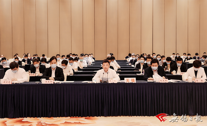 市委書記杜小剛在無錫分會(huì)場(chǎng)匯報(bào)相關(guān)工作情況。市長(zhǎng)趙建軍,市委副書記朱愛勛等參加會(huì)議。