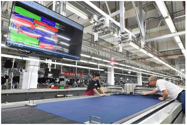 走進(jìn)其中一個(gè)智能車間,每位制衣工人的工位上,都有一塊顯示屏,上面顯示每件衣服需要完成的工藝,包括每個(gè)工人當(dāng)天的待完成工作量,同時(shí)對(duì)應(yīng)具體的加工收入等個(gè)人工作效益。在流水線上,從前的“人找衣服”,成了“衣服找人”,自動(dòng)裁床剪裁好的面料,會(huì)依次匹配給最擅長(zhǎng)此工序的作業(yè)人員,達(dá)到在單位時(shí)間內(nèi)的效能最大化。相關(guān)負(fù)責(zé)人介紹,集團(tuán)內(nèi)部企業(yè)打造的個(gè)性化定制+5G柔性生產(chǎn)智慧工廠,公司實(shí)現(xiàn)在制品庫(kù)存下降30%,工廠單耗成本下降10%,提高生產(chǎn)效率20%,實(shí)現(xiàn)了服裝制造鏈全過(guò)程的智能化。