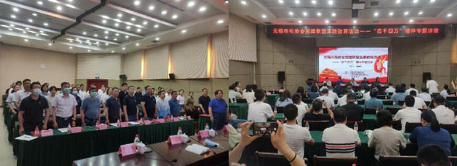 以學鑄魂、以學增智、以學正風、以學促干。為全面貫徹黨的二十大精神,按照2023 年黨建聯(lián)盟活動方案要求,2023 年5 月30 日上午,由無錫市場協(xié)會黨支部主辦,無錫盛陽食品城黨支部和江蘇港下雙面呢市場黨支部協(xié)辦的“四千四萬”精神黨課主題教育活動,在中國企業(yè)無錫培訓中心9 號樓一樓綜合報告廳召開。無錫市場協(xié)會黨建聯(lián)盟十八個黨支部的黨員共98 人參加。活動由黨建聯(lián)盟發(fā)起單位無錫市場協(xié)會黨支部書記楊四方主持。