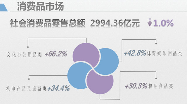 2020年全市實(shí)現(xiàn)社會(huì)消費(fèi)品零售總額2994.36億元,同比下降1.0%。從大類商品限上零售額來(lái)看,增長(zhǎng)較快的文化辦公用品類、體育娛樂(lè)用品類、機(jī)電產(chǎn)品及設(shè)備類、糧油食品類零售額分別同比增長(zhǎng)66.2%、42.8%、34.4%、30.3%。