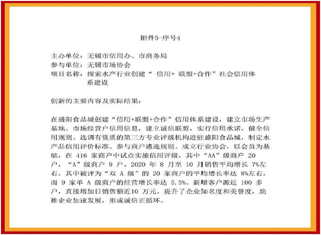 2020 年3 月至9 月,公司組織和召開(kāi)各類(lèi)相關(guān)大小會(huì)議近30 場(chǎng),各類(lèi)大型會(huì)議7 場(chǎng),各類(lèi)文件、申報(bào)資料、整改資料、行業(yè)標(biāo)準(zhǔn)等近1000 份,包括首次成文的《水產(chǎn)行業(yè)評(píng)級(jí)標(biāo)準(zhǔn)》及《水產(chǎn)行業(yè)指導(dǎo)標(biāo)準(zhǔn)》,文宣近10 篇,閱讀人數(shù)共計(jì)10 萬(wàn)多。通過(guò)信用體系建設(shè)試點(diǎn),提升了企業(yè)知名度和美譽(yù)度,助推企業(yè)加速發(fā)展,形成誠(chéng)信正循環(huán)。2020 年8 月至10 月市場(chǎng)銷(xiāo)售平均增長(zhǎng)7%左右,其中被評(píng)為“2 A 級(jí)”的20 家商戶(hù)的平均增長(zhǎng)率達(dá)8%左右,9 家A 級(jí)商戶(hù)的經(jīng)營(yíng)增長(zhǎng)率達(dá)5.5%。新增客戶(hù)源近100 多戶(hù),直接增加日銷(xiāo)售額近10 萬(wàn)元。2021 年,《探索水產(chǎn)行業(yè)創(chuàng)建“信用+聯(lián)盟+合作”社會(huì)信用體系建設(shè)》項(xiàng)目被江蘇省社會(huì)信用體系建設(shè)領(lǐng)導(dǎo)小組辦公室評(píng)定為“2020 年度省社會(huì)信用體系建設(shè)工作創(chuàng)新項(xiàng)目”。