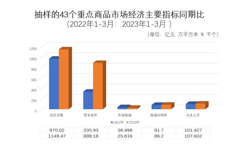 隨著疫情防控政策調(diào)整,社會(huì)經(jīng)濟(jì)迎來了全面復(fù)蘇和發(fā)展。今年一季度,無錫市各類商品交易市場認(rèn)真學(xué)習(xí)貫徹黨的二十大和中央經(jīng)濟(jì)工作會(huì)議精神,按照省、市政府部門的決策部署,積極行動(dòng),落實(shí)到位,守正創(chuàng)新,奮進(jìn)作為,商品交易市場經(jīng)濟(jì)運(yùn)行迎來總體形勢向好的喜人局面,有些行業(yè)已加速恢復(fù)到疫情前平均水平,發(fā)展態(tài)勢出現(xiàn)穩(wěn)步上升。據(jù)無錫市場協(xié)會(huì)對(duì)各行業(yè)具有代表性的四十三個(gè)市場2023年1-3月與2022年 1-3 月抽樣統(tǒng)計(jì)同期比較,一季度市場成交總額1149.47億元人民幣,同比增長18.5%。其中:1、生產(chǎn)資料行業(yè)11 個(gè)市場成交總額873.79億元,同比增長7 %;2、工業(yè)品、小商品、消費(fèi)品行業(yè)8個(gè)市場成交總額36.7億元,同比增長26%;3、建材家居裝潢行業(yè)6個(gè)市場成交總額52.9億元,同比增長178%;4、農(nóng)副產(chǎn)品批發(fā)行業(yè)8 個(gè)市場成交總額164.67億元,同比增長58.09%;5、農(nóng)貿(mào)市場行業(yè)10個(gè)市場成交總額21.4億元,同比增長95%。商品交易市場經(jīng)濟(jì)增量明顯,表明無錫經(jīng)濟(jì)正在回暖。如下圖所示: 相較于疫情前的2019年1-3月市場交易總額1008.7億元,2023年增長了13.9%。其中建材家具市場增長了137%,農(nóng)副產(chǎn)品市場增長了62%,市場需求明顯提升;生產(chǎn)資料市場增長了6%,工業(yè)小商品市場和農(nóng)貿(mào)市場也均有5%-10%的增幅。由于市場優(yōu)化升級(jí),發(fā)展戰(zhàn)略調(diào)整,采樣單位有的已經(jīng)搬遷、有的進(jìn)行合并,不能進(jìn)行統(tǒng)一的縱向比較,但經(jīng)濟(jì)總體形勢展現(xiàn)出穩(wěn)步向上、小幅超越的特點(diǎn)。如下圖所示: 具體分析,主要有以下幾個(gè)方面的特點(diǎn):一、生產(chǎn)資料行業(yè)本文主要采樣了無錫國聯(lián)金屬材料市場、無錫南方不銹鋼市場、無錫碩放不銹鋼物流園、江陰貫莊金屬材料市場、無錫中儲(chǔ)金屬材料交易市場、無錫五洲工業(yè)博覽城、無錫中恒鋼材市場、無錫偉達(dá)五金、宜興國際環(huán)保城、江陰長江港口綜合物流園區(qū)、江陰紡織市場、江陰港國際木材交易中心、江陰鑫遠(yuǎn)倉儲(chǔ)、江蘇長陽金屬材料市場等無錫市各區(qū)域具有市場影響力的生產(chǎn)資料市場。其中,無錫國聯(lián)金屬材料市場、無錫南方不銹鋼市場、江陰貫莊金屬材料市場分別展現(xiàn)了一季度同比增長60%、38%、15%的良好態(tài)勢。從抽樣統(tǒng)計(jì)數(shù)據(jù)來看,市場商鋪出租率與市場成交總額同期比增長基本成正相關(guān)關(guān)系。11個(gè)生產(chǎn)資料市場中有8家市場商鋪出租率保持在80%以上:無錫國聯(lián)金屬材料市場商鋪出租率90.02%,無錫南方不銹鋼市場98.60%,無錫碩放不銹鋼物流園90.00%,無錫中儲(chǔ)金屬材料交易市場98.00%,無錫五洲工業(yè)博覽城96%,無錫中恒鋼材市場88%、江陰長江港口綜合物流園區(qū)95%,江陰貫莊金屬材料市場88%。以上8家市場成交總額大都實(shí)現(xiàn)同比增長。江陰紡織市場75%,江陰港國際木材交易中心72%,宜興國際環(huán)保城14%。出租率低于80%的市場成交總額同期比均出現(xiàn)少增長或負(fù)增長。尤其是宜興國際環(huán)保城,市場商鋪出租率僅有14%,公司一季度成交總額僅0.0053億元,與2022年同期比下滑67.01%,市場業(yè)績明顯還未從疫情沖擊中復(fù)蘇。但也應(yīng)看到無錫碩放不銹鋼物流園、無錫中儲(chǔ)金屬材料交易市場等商鋪出租率達(dá)到90.00%、98.00%,成交總額同期比卻分別下滑16.6%、20%的不良局面。表明制造業(yè)市場經(jīng)濟(jì)復(fù)蘇還比較緩慢,黑色金屬價(jià)格波動(dòng)區(qū)間大。鋼材、木材等原材料需求恢復(fù)較慢,這與近年來房地產(chǎn)行情遇冷、基建開工不及預(yù)期和下游需求減弱的影響相關(guān)。二、工業(yè)品、小商品、消費(fèi)品行業(yè)本文主要采樣了江蘇港下雙面呢市場、無錫皮革城、無錫輕紡城(電動(dòng)車、摩托車等)、無錫華東商貿(mào)城、無錫人和國際招商城、無錫百業(yè)超市、無錫舊貨市場、無錫神州二手車交易市場、無錫夢之島通信市場、無錫九龍灣花都市場等無錫市各區(qū)域深得消費(fèi)者青睞的工業(yè)品、小商品、消費(fèi)品市場。從抽樣統(tǒng)計(jì)數(shù)據(jù)來看,一季度工業(yè)品、小商品、消費(fèi)品市場同比2022年上升了26%,實(shí)現(xiàn)了成交總額36.7億元人民幣??梢钥闯?,后疫情時(shí)代市場表現(xiàn)出積極向好的發(fā)展信心。工業(yè)品、小商品、消費(fèi)品市場在洗牌重塑的同時(shí),也積極進(jìn)行著細(xì)分優(yōu)化。服裝、皮革、車輛、花卉等市場加快升級(jí),補(bǔ)短板,構(gòu)建經(jīng)營新優(yōu)勢,經(jīng)濟(jì)發(fā)展表現(xiàn)出上揚(yáng)態(tài)勢:2023年一季度江蘇港下雙面呢市場實(shí)現(xiàn)成交總額1.45億元,同比增長3%;無錫皮革城成交總額1.8億元,同比增長10%;無錫輕紡城(電動(dòng)車、摩托車等)成交總額2.61億元,同比增長11%;無錫人和國際招商城成交總額15億元,同比增長7%;無錫神州二手車交易市場成交總額3.2億元,同比增長19%;無錫九龍灣花都市場成交總額0.01萬元,同比增長11%。但是,近幾年受疫情