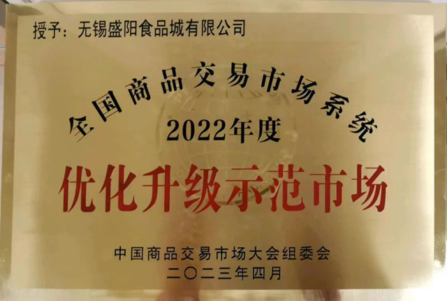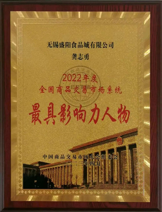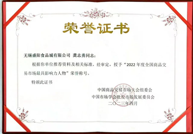 在先進典型展播環(huán)節(jié),大會授予無錫盛陽食品城有限公司《2022年度全國商品交易市場系統(tǒng)優(yōu)化升級示范市場》榮譽,盛陽董事長龔志勇更是獲得《2022年度全國商品交易市場系統(tǒng)最具影響力人物》殊榮。