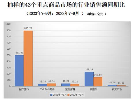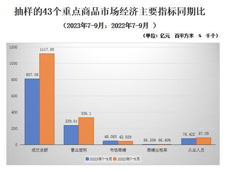 從抽樣的43個(gè)重點(diǎn)商品市場(chǎng)經(jīng)濟(jì)主要指標(biāo)匯總情況來(lái)看,2023年7-9月與2022年7-9月同期相比,生產(chǎn)資料行業(yè)銷(xiāo)售額下降44%,工業(yè)品小商品消費(fèi)品行業(yè)下降15%,建材家居行業(yè)、農(nóng)副批發(fā)行業(yè)、農(nóng)貿(mào)市場(chǎng)呈現(xiàn)穩(wěn)步向上態(tài)勢(shì),分別增長(zhǎng)28%、60.84%、38%。整體同比下滑27.8%。市場(chǎng)商鋪出租率與去年同比基本持平,保持在86%左右。從業(yè)人員同比減少8668人,減幅近一成。表明我市商品交易市場(chǎng)經(jīng)濟(jì)增長(zhǎng)、回穩(wěn)向上的發(fā)展態(tài)勢(shì)出現(xiàn)波動(dòng),政府政策杠桿作用正在顯現(xiàn)。