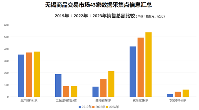 從圖1可以看出,從2019年到2023年,無(wú)錫商品交易市場(chǎng)五大行業(yè)中,除工業(yè)品消費(fèi)品行業(yè)銷售業(yè)績(jī)未恢復(fù)到2019年疫情前水平外,其他如生產(chǎn)資料、建材裝潢、農(nóng)副產(chǎn)品批發(fā)、農(nóng)貿(mào)市場(chǎng)四大行業(yè)均恢復(fù)到2019年疫情前的水平,并呈現(xiàn)出穩(wěn)步增長(zhǎng)的向上勢(shì)頭。