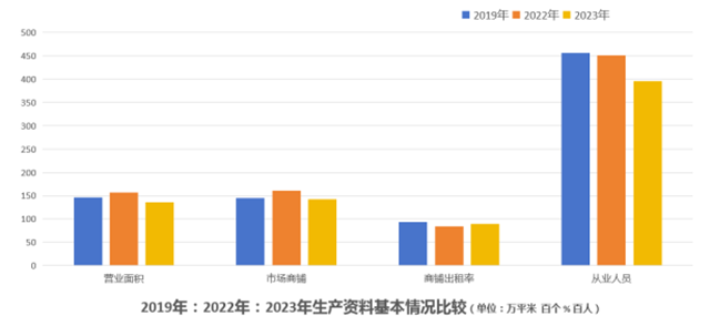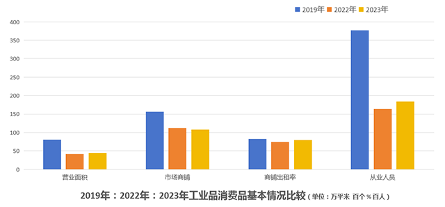 據(jù)統(tǒng)計(jì)數(shù)據(jù)顯示,2023年生產(chǎn)資料行業(yè)銷售總額恢復(fù)性增長(zhǎng),但在營(yíng)業(yè)面積、市場(chǎng)商鋪數(shù)量、商鋪出租率、從業(yè)人員數(shù)量等方面(如圖3所示)與2022年四項(xiàng)指標(biāo)相比出現(xiàn)下滑;同2019年相比,2023年?duì)I業(yè)面積和從業(yè)人員未恢復(fù)到疫情前水平。當(dāng)然,這些基本情況并不能直接反映市場(chǎng)運(yùn)行情況,特別是不能與市場(chǎng)成交額掛鉤。但是從另一個(gè)方面也反映了該行業(yè)各市場(chǎng)不斷完善市場(chǎng)功能,互聯(lián)網(wǎng)信息平臺(tái)搭建、創(chuàng)新供應(yīng)鏈服務(wù)業(yè)務(wù)、商務(wù)誠(chéng)信體系建設(shè)、品牌創(chuàng)建等,為客戶提供便捷、高效、個(gè)性化服務(wù),市場(chǎng)逐步在朝著多元化方向的發(fā)展。