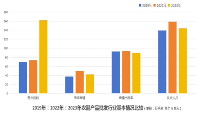 如圖6所示,在抽樣的8家我市主要農(nóng)副產(chǎn)品批發(fā)市場(chǎng)的數(shù)據(jù)中顯示:2023年農(nóng)副產(chǎn)品批發(fā)行業(yè)在營(yíng)業(yè)面積、市場(chǎng)商鋪總數(shù)、市場(chǎng)商鋪出租率、從業(yè)人員方面已經(jīng)恢復(fù)到2019年疫情前水平。其中,2023年?duì)I業(yè)面積相比2022年、2019年出現(xiàn)翻倍增長(zhǎng)的現(xiàn)象。