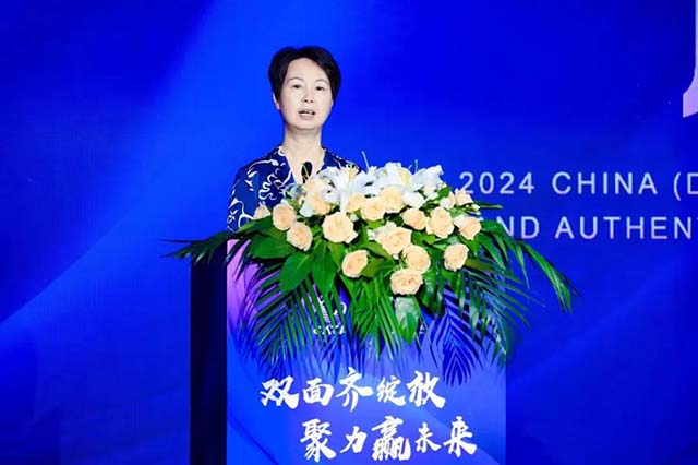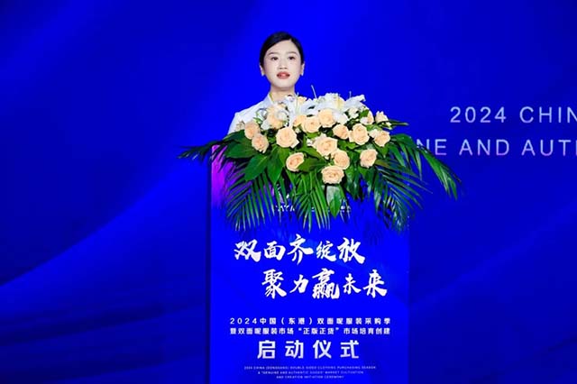 中國(東港)雙面呢服裝交易市場黨支部書記戴佳夢向蒞臨現(xiàn)場的所有來賓表達了熱烈的歡迎和誠摯的感謝,她表示,中國(東港)雙面呢服裝交易市場通過七年多的傾力打造 ,已經(jīng)成為目前國內(nèi)唯一的雙面呢服裝專業(yè)批發(fā)市場。每年采購季的新品發(fā)布會是市場最重要的一次活動,也是向全國采購商展現(xiàn)雙面呢產(chǎn)品特色的重要平臺,今年我們更是借此機會啟動“正版正貨”市場培育創(chuàng)建,進一步鞏固雙面呢服裝市場品牌形象和信譽度,樹立行業(yè)標(biāo)桿。