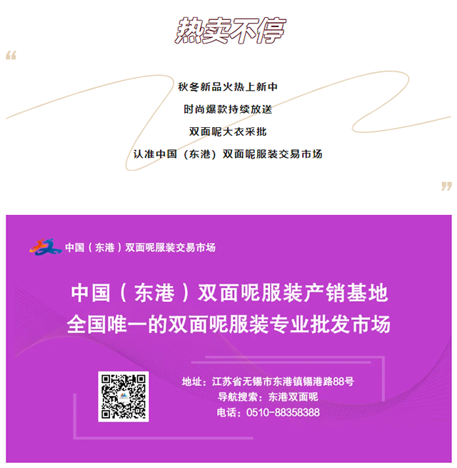 秋來(lái)無(wú)聲,秋韻有形,不經(jīng)意間,拂面的清風(fēng)帶來(lái)絲絲涼意。中國(guó)(東港)雙面呢服裝交易市場(chǎng)秋冬雙面呢大衣全面上新,貨源充足,火力全開(kāi),海量高品質(zhì)、高時(shí)尚度和高性?xún)r(jià)比的精品雙面呢大衣任你挑選,歡迎全國(guó)各地采購(gòu)商前來(lái)選購(gòu)!