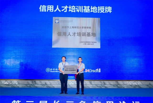 論壇現(xiàn)場,“信用人才培訓(xùn)基地”首塊牌子授予了上海師范大學(xué)商學(xué)院,并為首批17位“信用分析師”頒發(fā)了資質(zhì)證書。